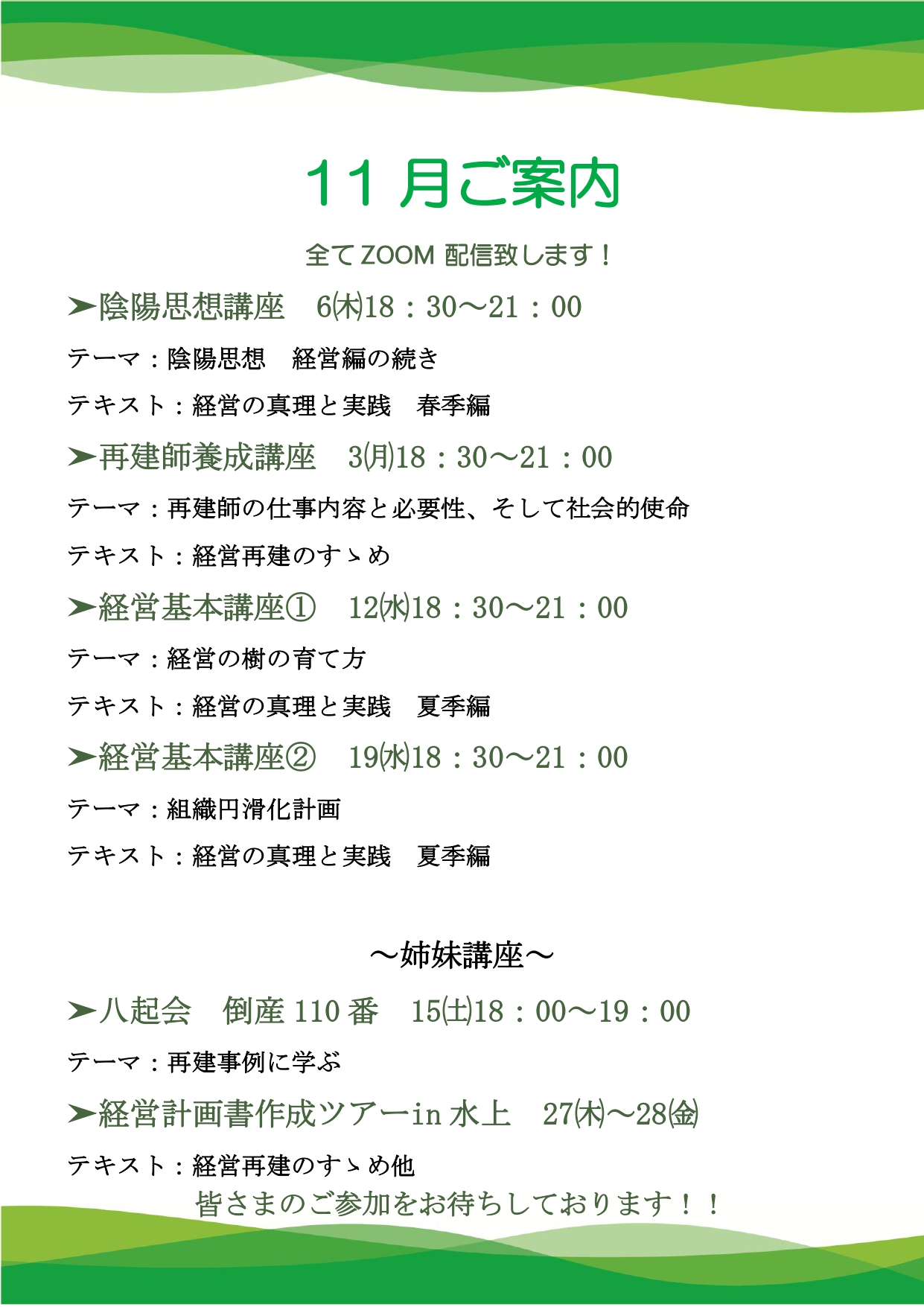 11月に名古屋・横浜にて開催される「経営基本講座」「陰陽思想講座」「再建師養成講座」のご案内を申し上げます。