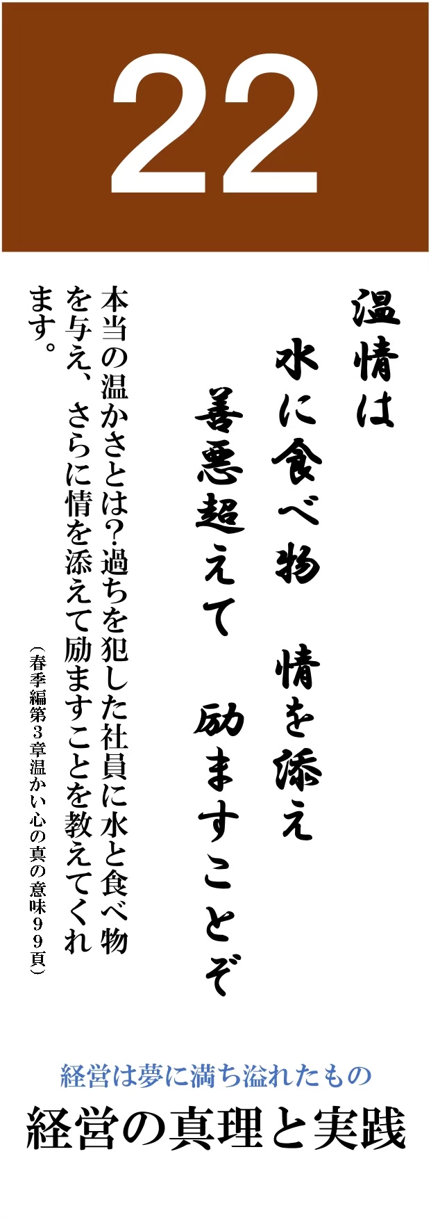 この考え方は、松下幸之助氏が社員の管理について語った言葉、「規則は厳格にし、実行に当たっては、そっと情を添えよ」という教えにも通じるものがあります。