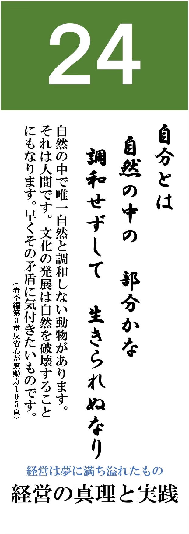 経営については、私は「経営の真理と実践」と題し、春・夏・秋・冬 の流れに重ねて整理してきました。